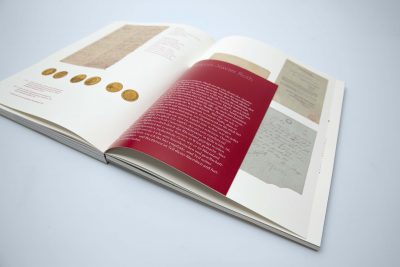 This year marks the 250th anniversary of the birth of the great Ludwig van Beethoven. The renowned art book publisher Wienand dedicates a remarkable book project to the master of composition, which already visually attracts all eyes. However, this only at second glance. First of all, the stiff brochure is protected by a glossy cover printed in one colour – nothing special. When you open it, the full splendour and sophistication of the book is revealed. The book cover convinces by hot foil stamping on the untreated grey cardboard. The book is interesting due to the open thread stitching and the coloured folded sheets, only 2/3 of which adorn the spine. For this purpose, coloured dividers in a shortened format are placed around the 16-page folded sheets with a head-to-tail-imposition. This technical cleverness creates a strong visual effect.