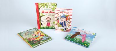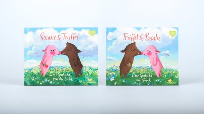 The books are published in various formats with round or straight spines and integrated endpapers. Especially interesting is the design as a so-called reversible book, which was realised for the title „Rosalie & Truffle – A story of love“. The story of the two title characters is told from two perspectives, starting from the U1 and U4 respectively and ending in the middle of the book.