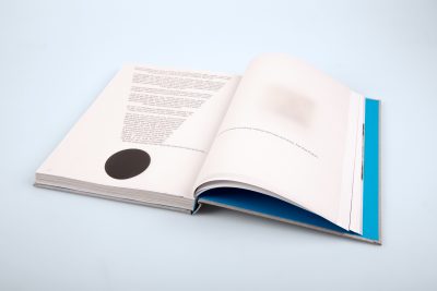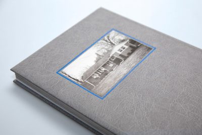 But you can feel the book not only in terms of content, but also haptically. The padded cover of the photo book is covered with a coated PVC material in leather-look vintage look. On the back of the cover there is a tip-on which has been glued to the previously embossed surface. Hotfoil embossing in blue and white also adorns the book cover. Although various features enhance the cover, it still looks quite plain overall. This is mainly due to the grey cover and the black and white printed tip-on. In the content there are two 4-page products made of translucent paper printed in one colour and a gatefold.