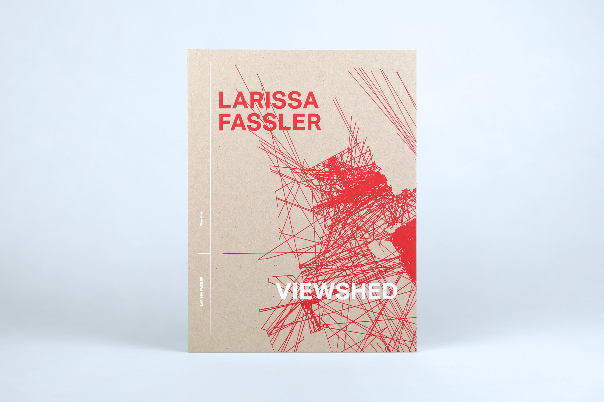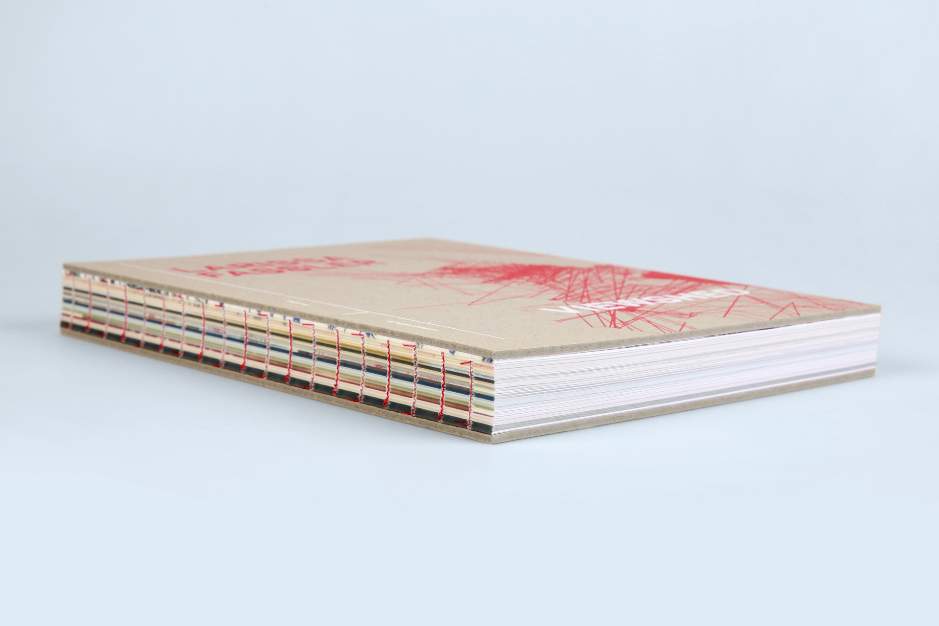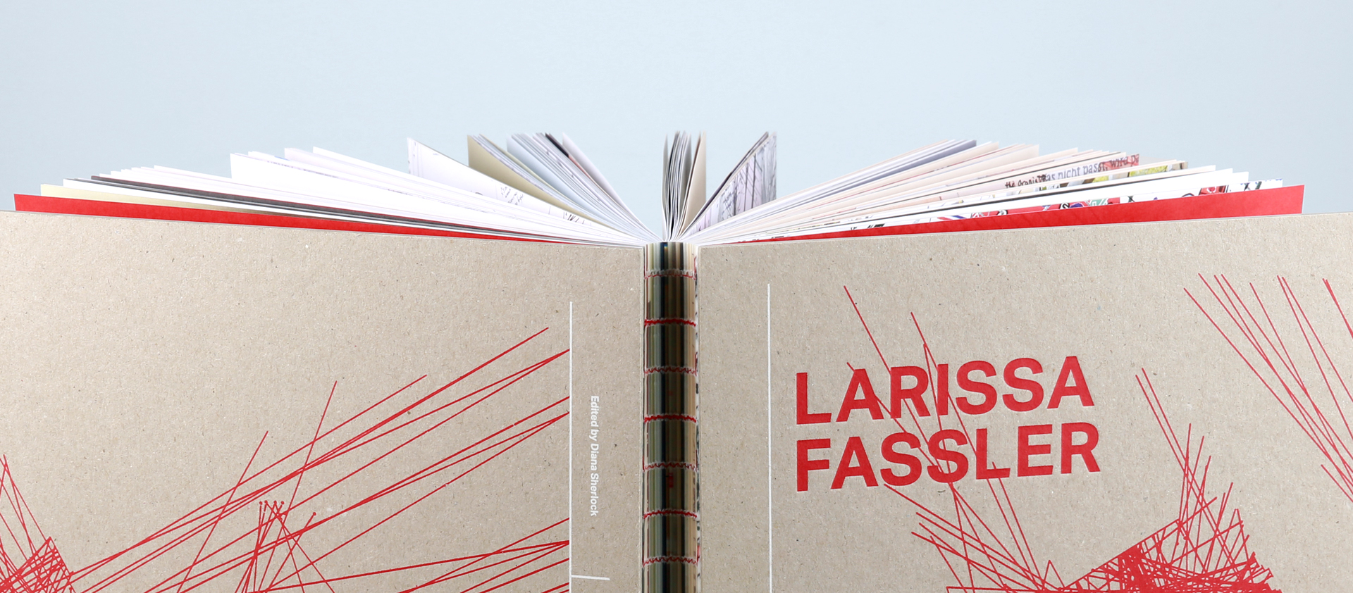 Fassler’s works have been published as a monograph in this large-format stiff brochure. It is not only the three-sided smooth cut with its straight lines that emphasises the artist’s architectural-geographical works. The open thread stitching also reveals parallels to the content, particularly through the choice of red stitching thread, the tone of which can be found in many of the works.