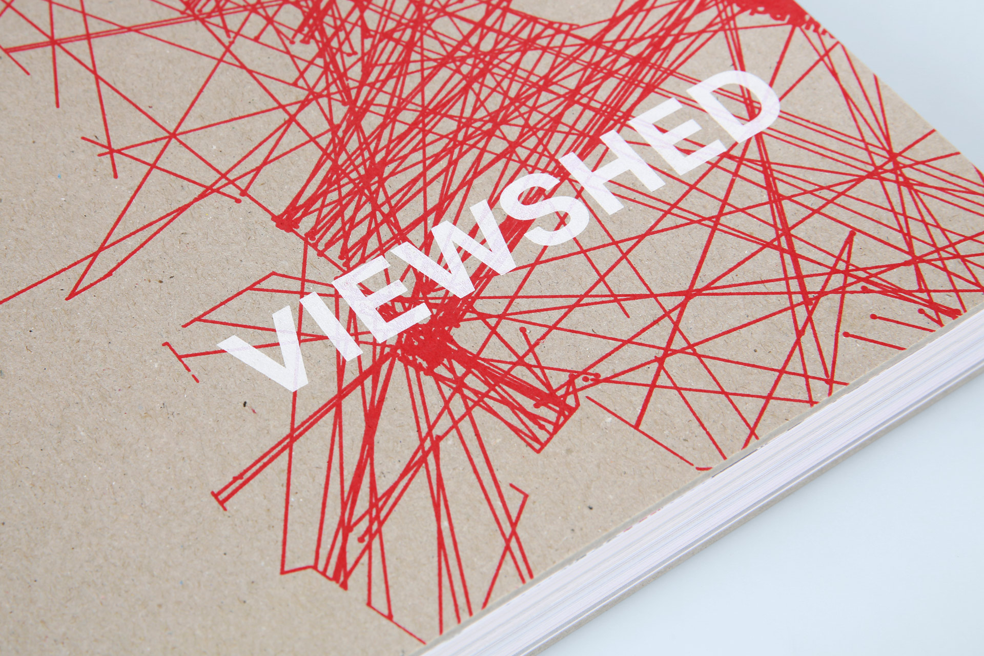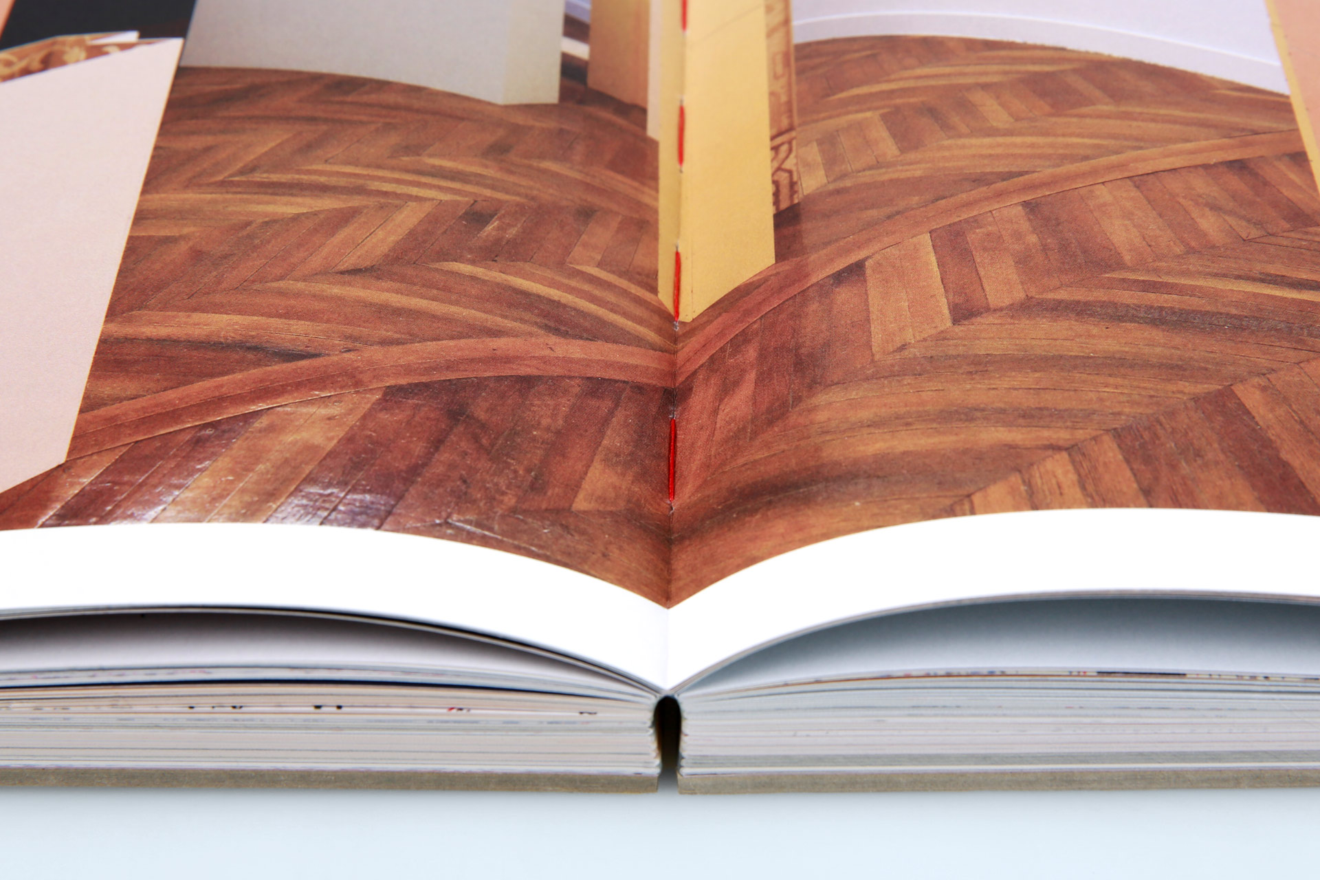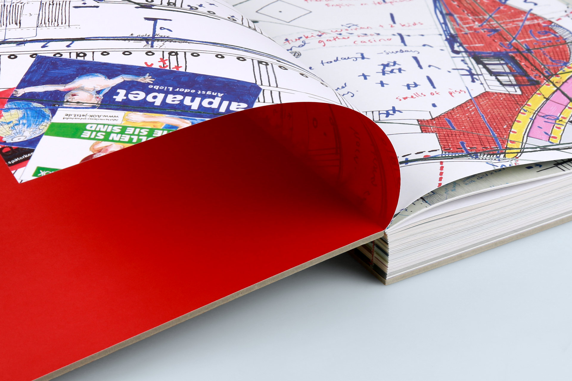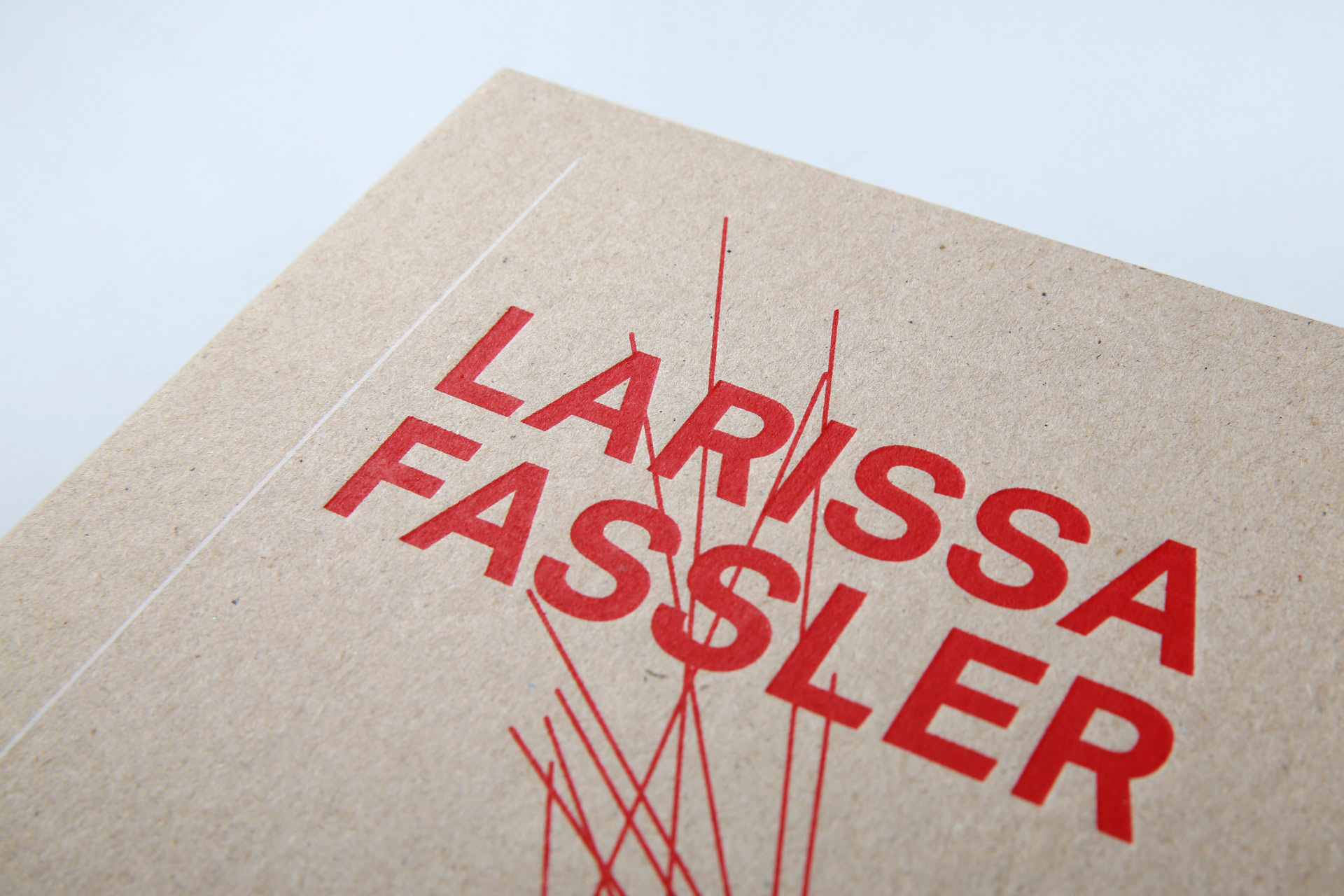 Fassler’s works have been published as a monograph in this large-format stiff brochure. It is not only the three-sided smooth cut with its straight lines that emphasises the artist’s architectural-geographical works. The open thread stitching also reveals parallels to the content, particularly through the choice of red stitching thread, the tone of which can be found in many of the works.