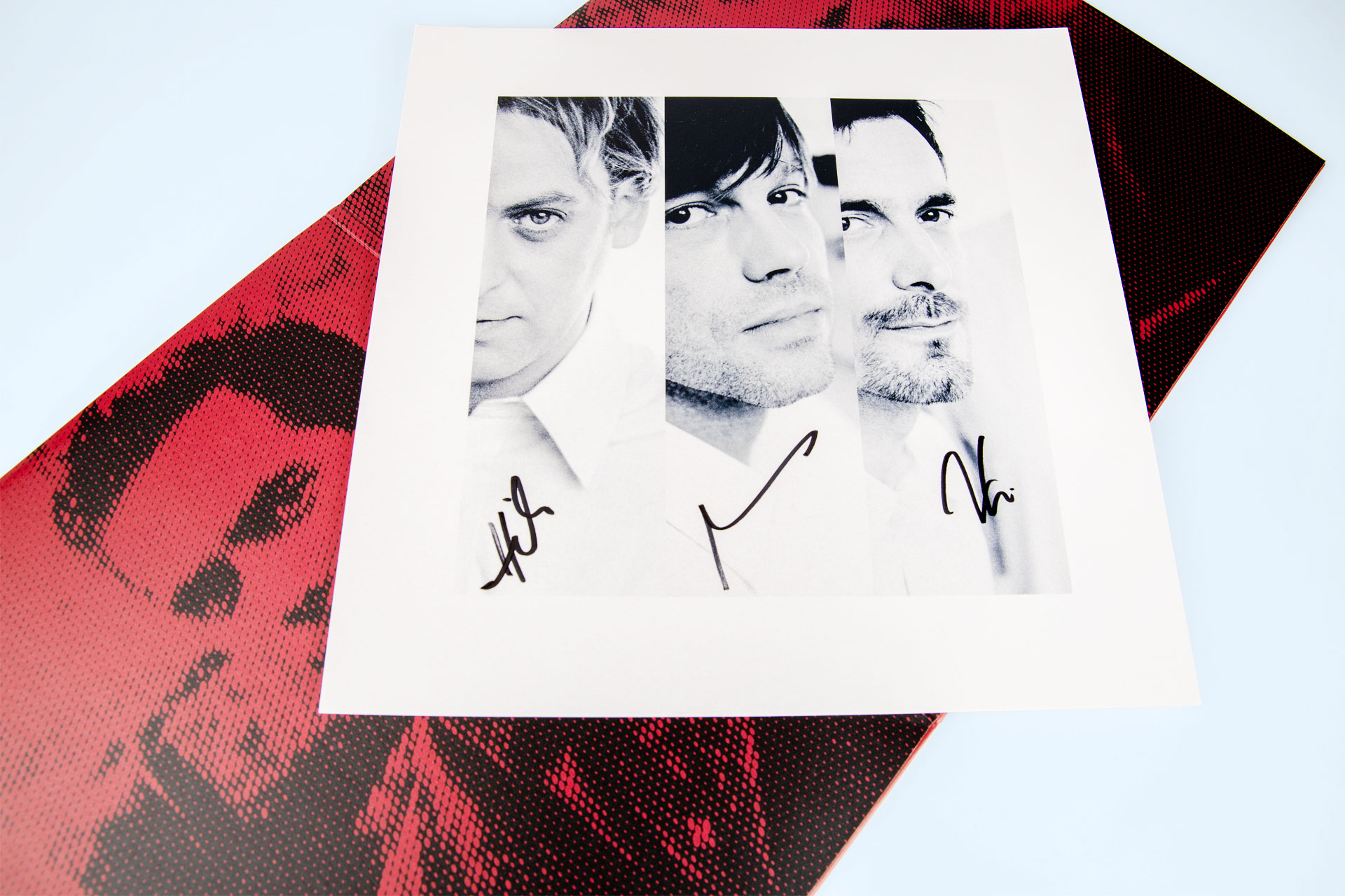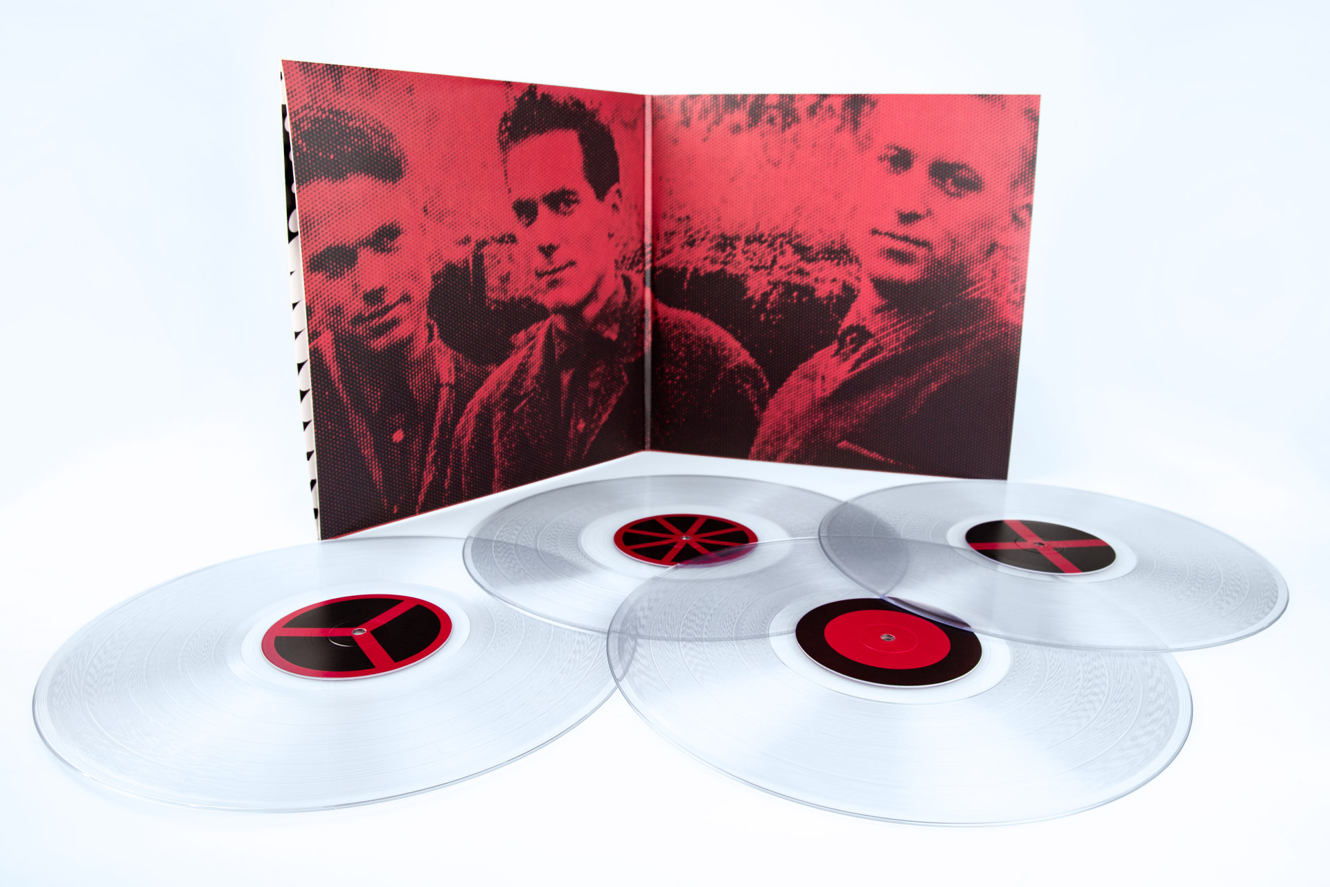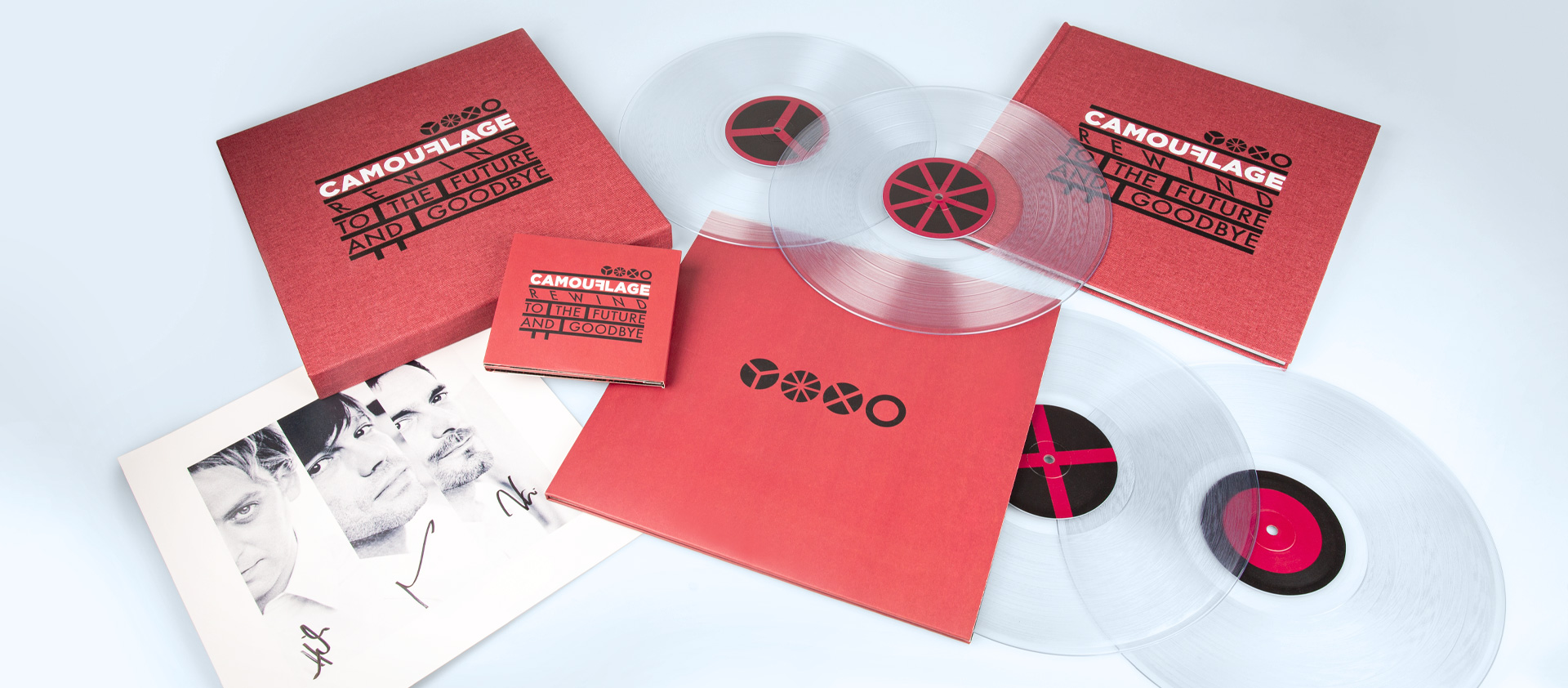 The box set, limited to 1,000 copies, comes in an elegant hardcover slipcase with linen cover and two-tone silk screen printing on the front. Inside is a gatefold with an 8-mm spine that can accommodate four 12inch vinyl records made of Crystal Clear (180g, heavyweight). These are packed in black inner sleeves. The gatefold was also made inside-out and finished with UV varnish. As a special highlight, a hand-signed art print with portraits of the band members in vinyl record format is included.
