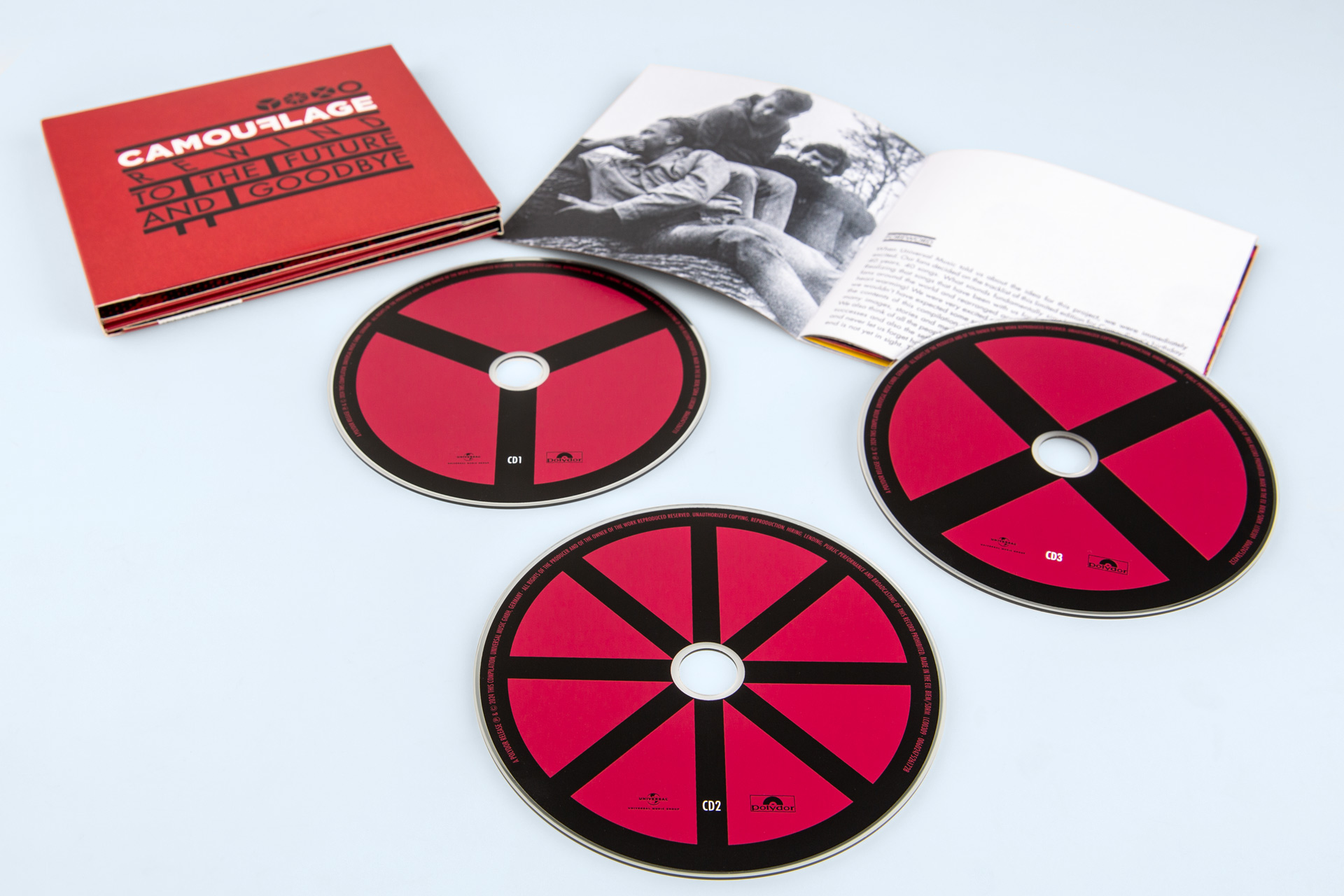 The three CDs are housed in an eight-page sleeve pac. A 32-page booklet, filled with images and exclusive content from 40 years of the band’s history, completes the product. The sleeves of the pacs are equipped with punched finger holes. The sleeve pacs were additionally finished with blind embossing and inside-out printing.
