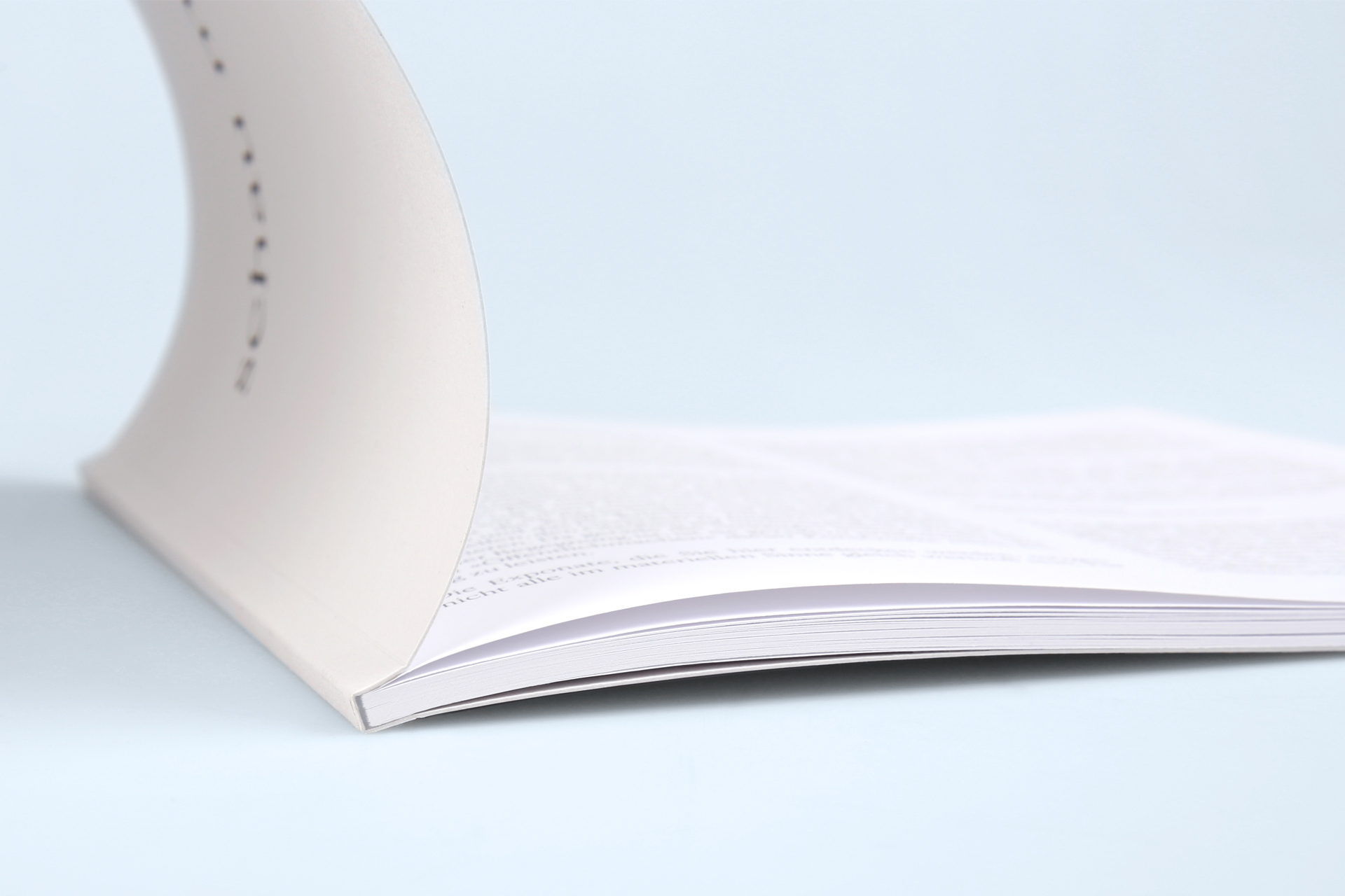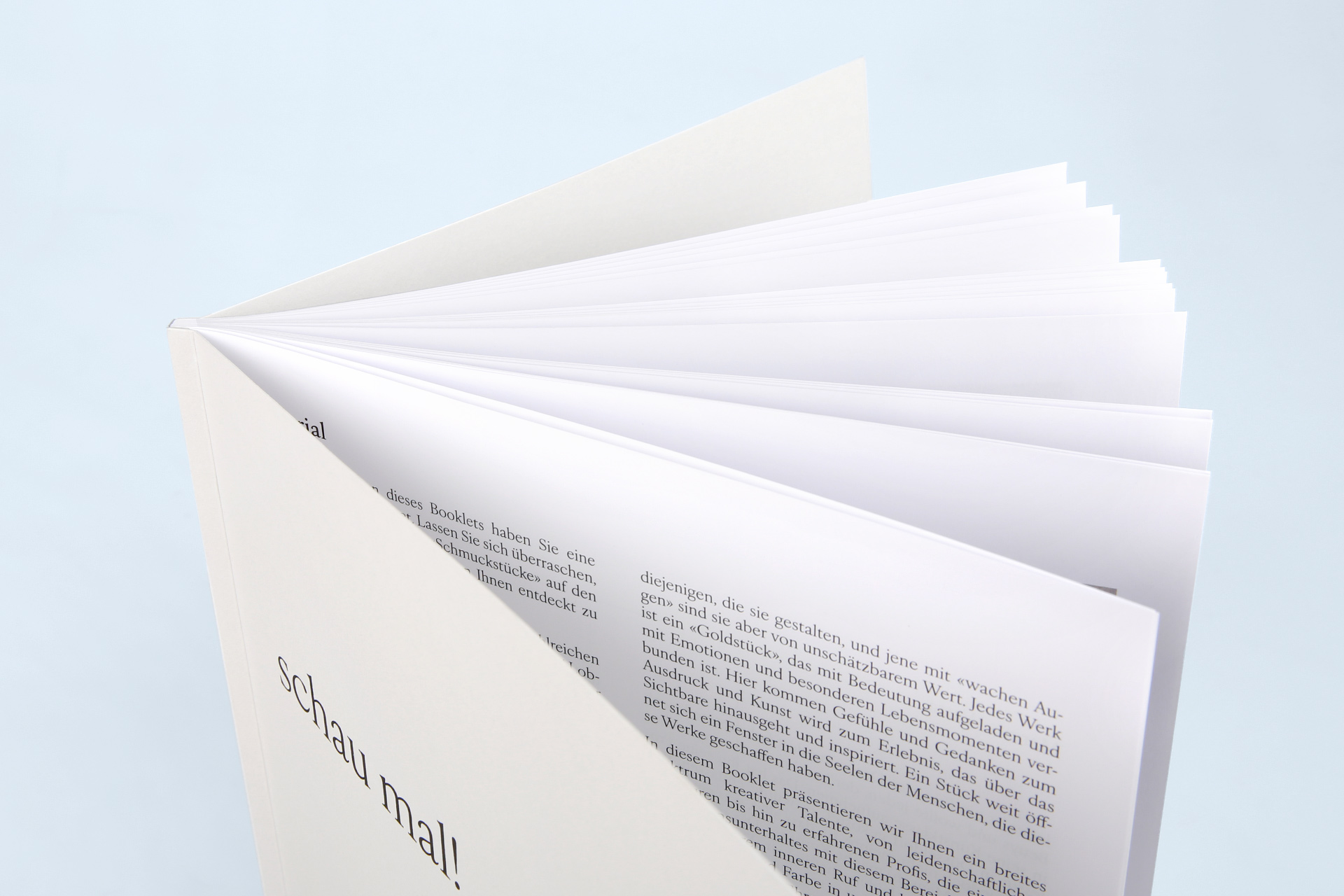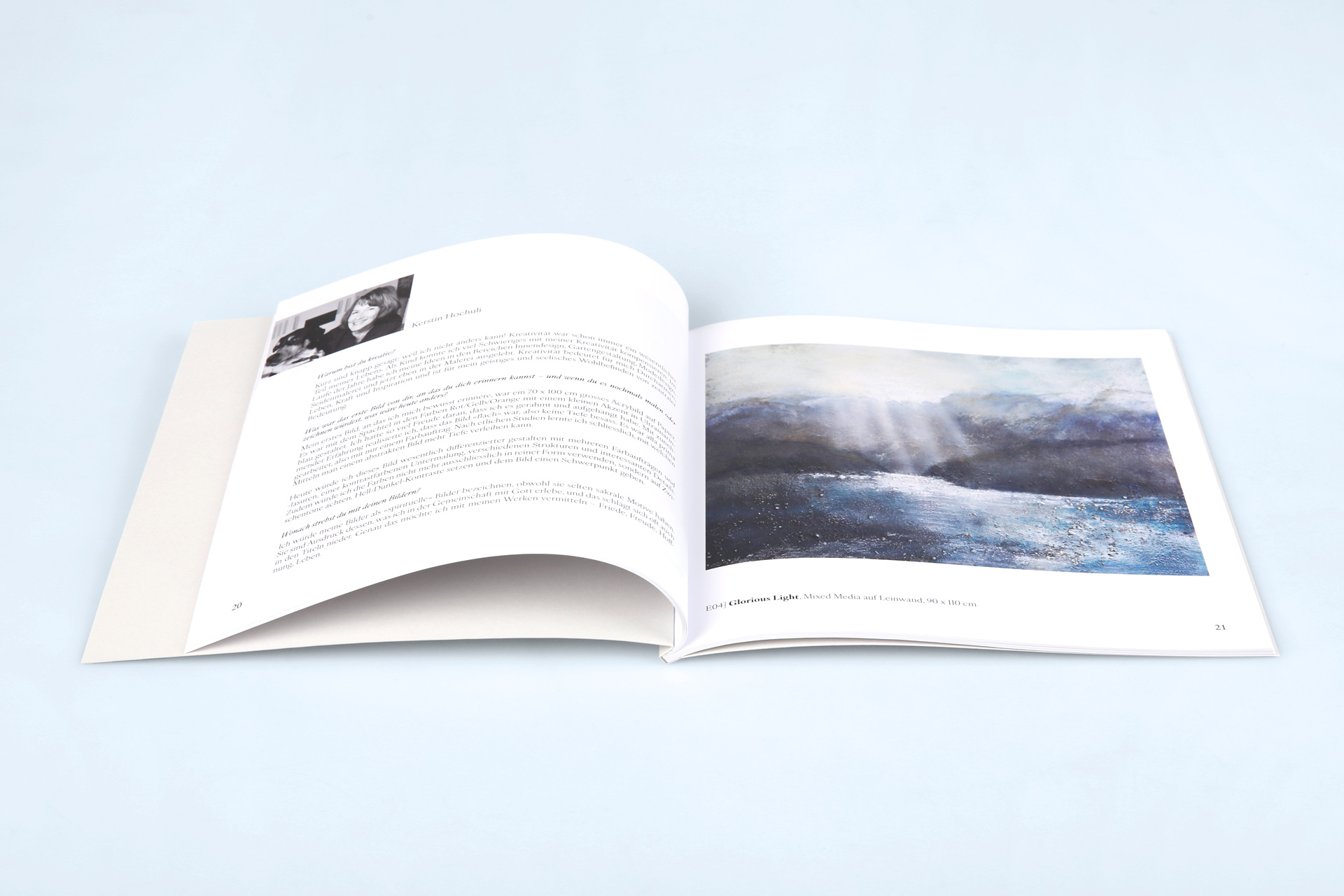 At first glance, the art catalog presents itself as reserved in a subtle, light grey and a harmonious, square format. The title and the names of the exhibitors appear in monochrome with special colour in black. With its 52 pages, the brochure has a slim spine of just five millimetres and a 4-fold grooving of the cover.