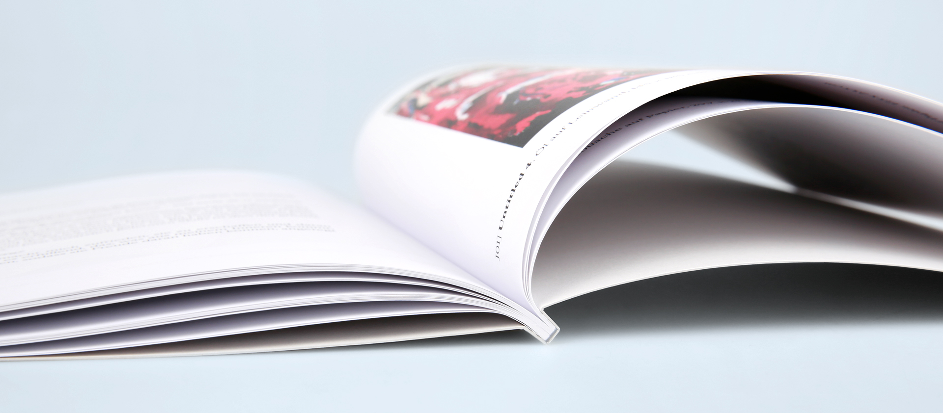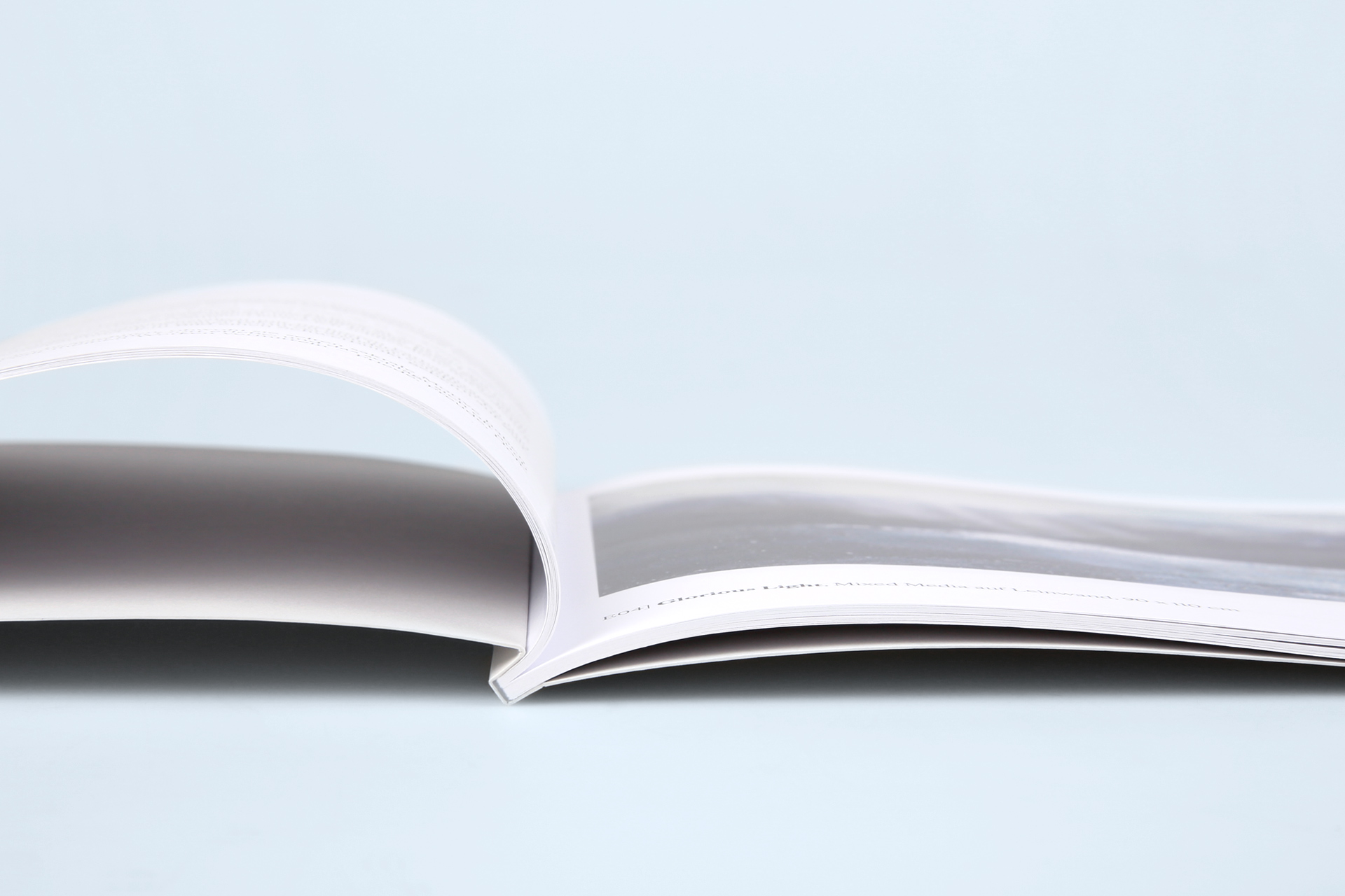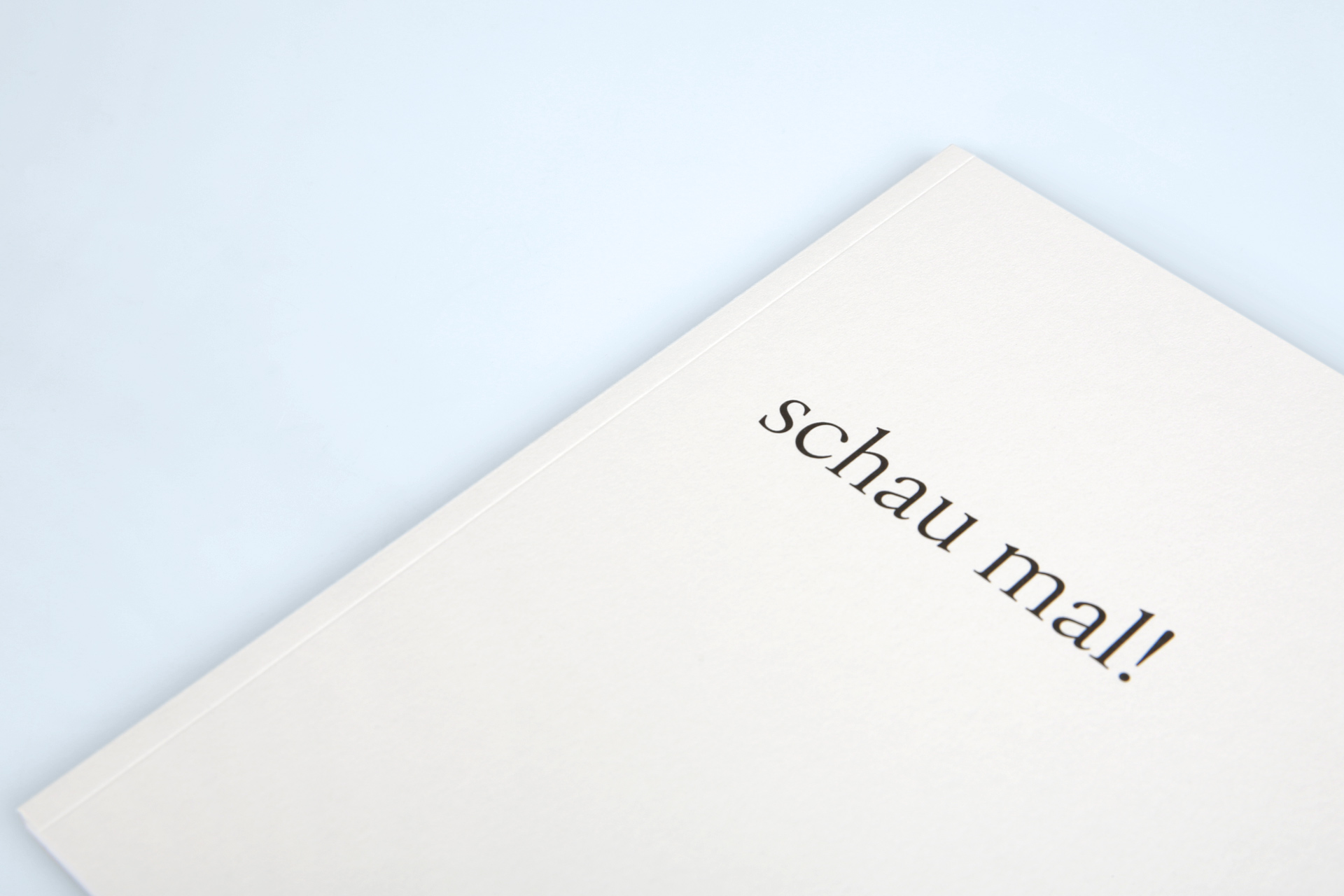 At first glance, the art catalog presents itself as reserved in a subtle, light grey and a harmonious, square format. The title and the names of the exhibitors appear in monochrome with special colour in black. With its 52 pages, the brochure has a slim spine of just five millimetres and a 4-fold grooving of the cover.