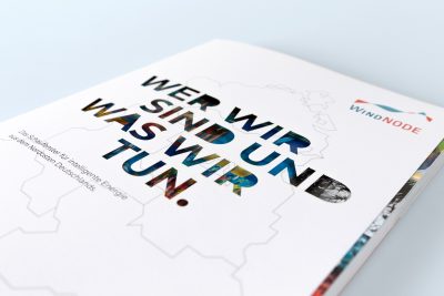 The cover is not only protection but also a mirror of the content. WindNODE is supported by the funding programme SINTEG – Showcase Intelligent Energy – Digital Agenda for the Energy Turnaround. So it is not surprising that the designers have come up with something very special for the cover – namely the design as an experienceable shop window which, thanks to cut-out typography, allows a view of the content.