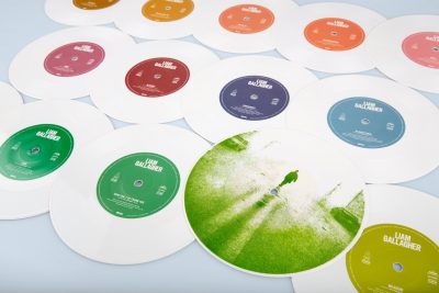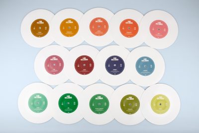 So every single sleeve with its 7inch vinyl record is a colour-matched unique item in this set – a perfectly round thing.