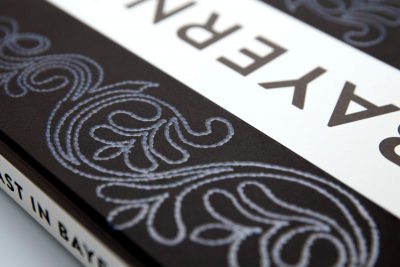 Die Raffinesse des Kochbuchs „Zu Gast in Bayern“ besteht aus einer mit Softtouchfolie kaschierten Buchdecke, die mit einem partiellen Relieflack veredelt wurde. Die Lackierung erinnert an die Bestickung einer für Bayern typischen „Krachledernen“.