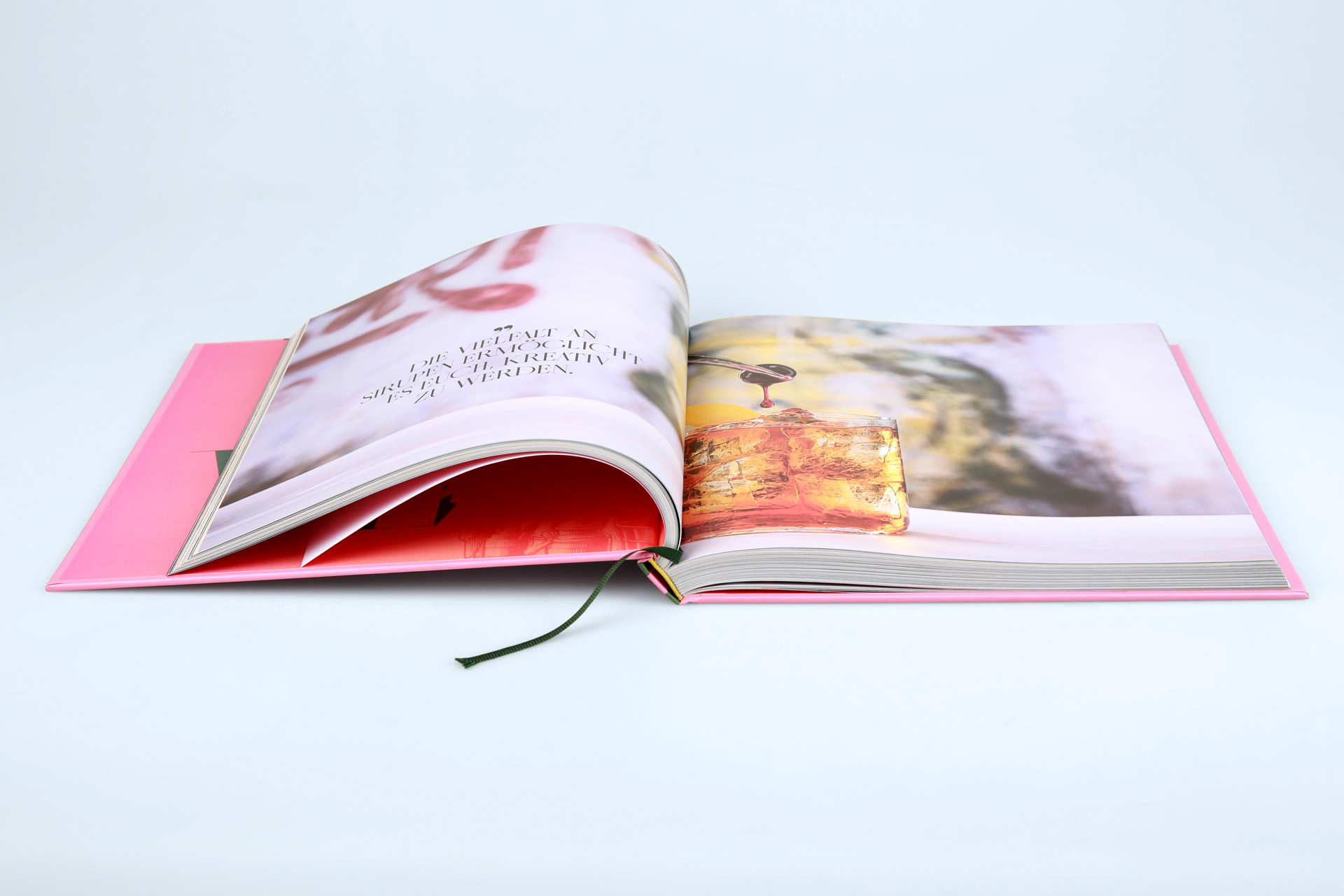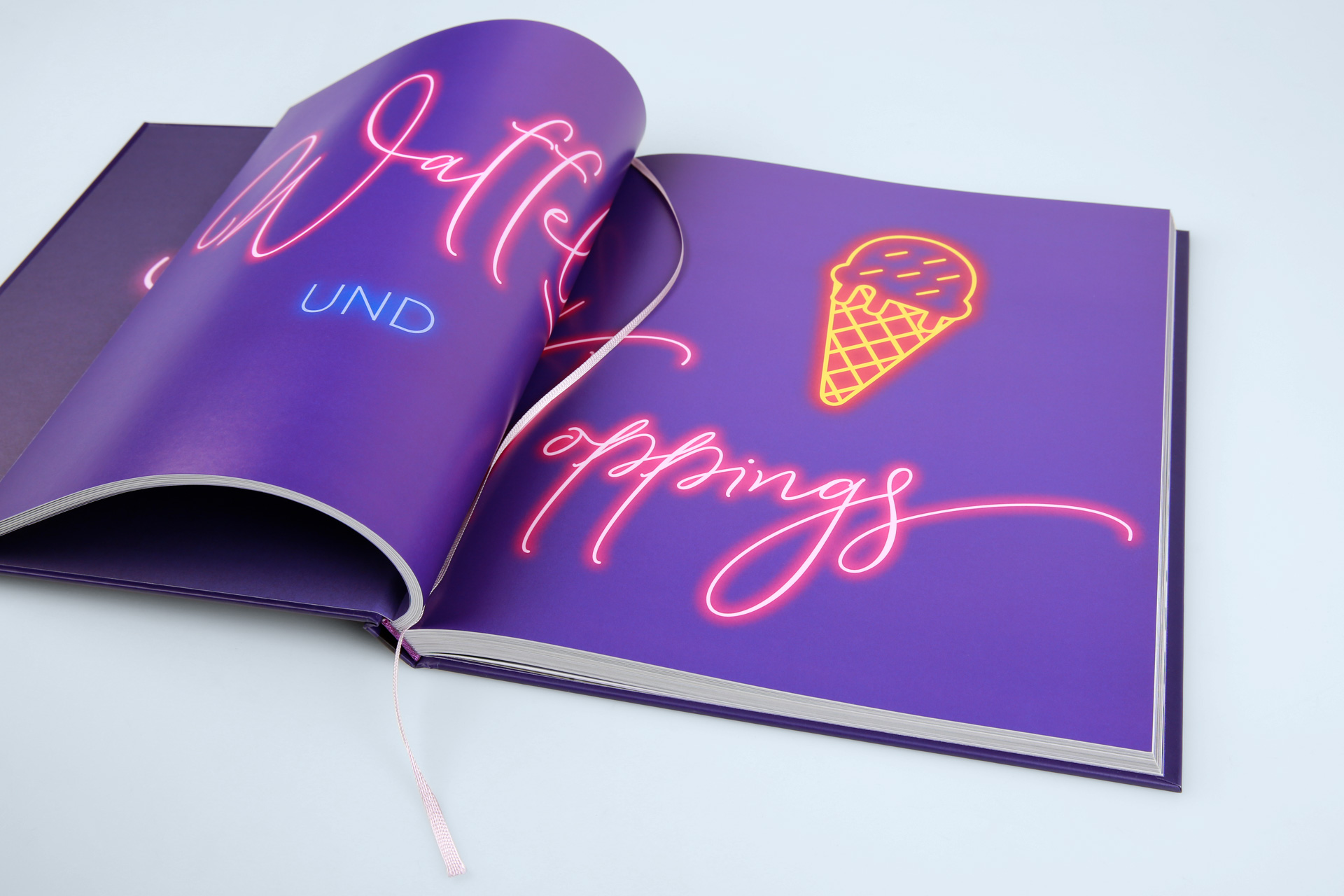 Leuchtend und auffallend wie eine Neonreklame zieht das Hardcover „Eis“ direkt sämtliche Aufmerksamkeit auf sich. Die mit einer kratzfesten Mattfolie bezogene Buchdecke bildet die perfekte Leinwand für die farbigen Linien des Layouts auf der U1. Diese wurden sowohl mit einer erhabenen Blindprägung als auch mit einem partiellen glänzenden UV-Lack veredelt. Dank der Veredelungen heben sich die hell leuchtenden Neonröhren von dem kontrastreichen dunklen Untergrund noch deutlicher ab und beginnen buchstäblich zu strahlen. Neben dem Titel birgt das Hardcover weitere Besonderheiten. So ist der Vorsatz verkürzt, was ein typisches Merkmal für Bücher des Callwey Verlags ist, und ergänzt wird das Rezeptbuch für Eisliebhaber mit einem Leseband in zartem Rosa.