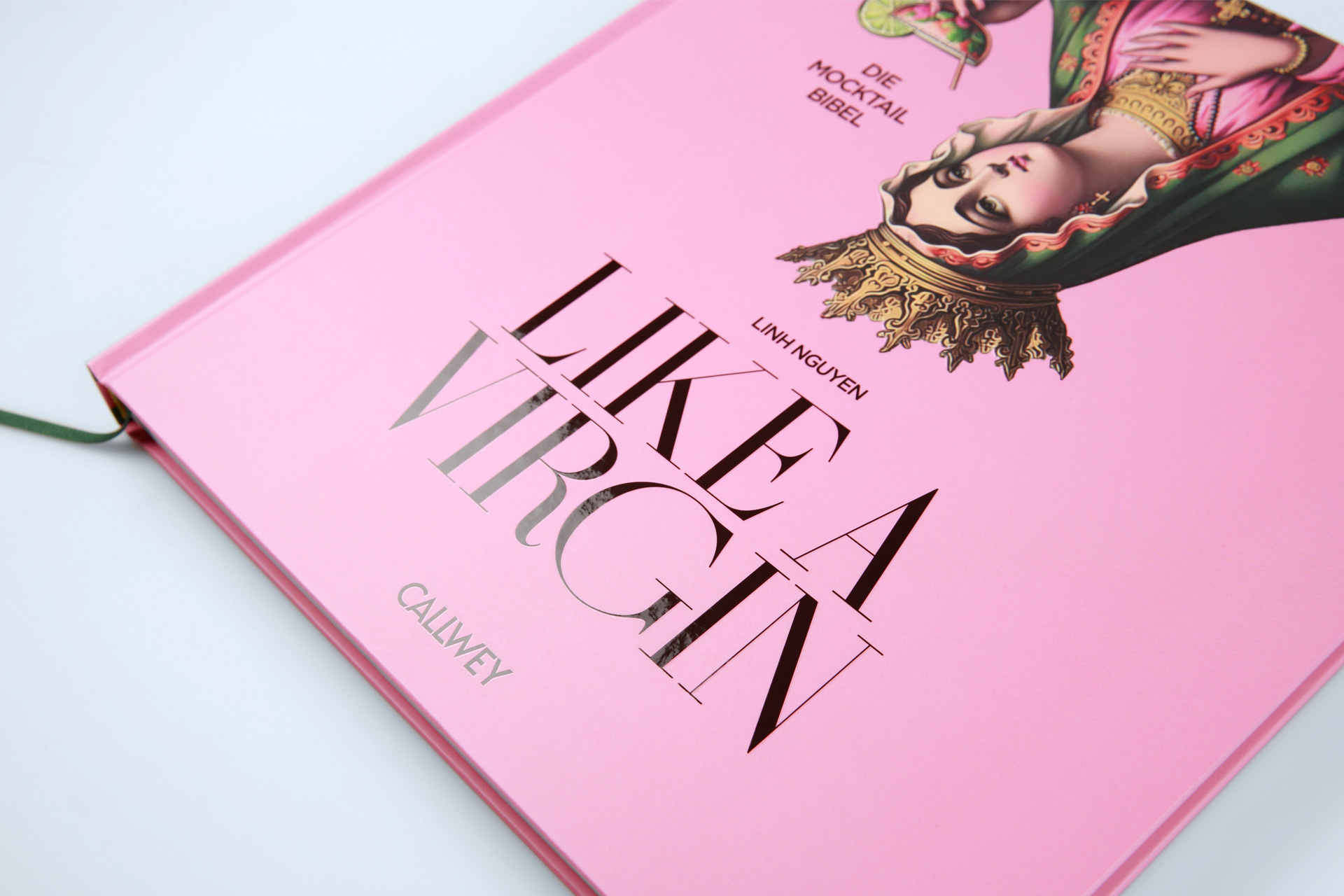 „Like A Virgin – Die Mocktail Bibel“ ist ebenfalls ein Hardcover mit einer kratzfesten Mattfolienkaschur. Die kopfüber abgebildete Madonna auf der U1 ist mit einer erhabenen Blindprägung hervorgehoben, der Schriftzug des Titels mit einem glänzenden UV-Lack veredelt. Der verkürzte Vorsatz und das moosgrüne, perfekt zum farblichen Layout der Buchdecke passende Lesenband runden dieses harmonische Buch über alkoholfreie Cocktails ab.