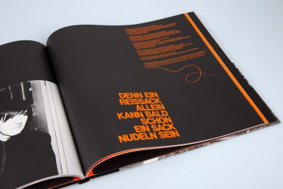 Die Pantone und der einfarbige Druck verschaffen dem durchdachten Layout einen konsistenten „orangenen Faden“ und machen das großformatige Premium LP-Buch zum Punkrock-Sammlerstück.