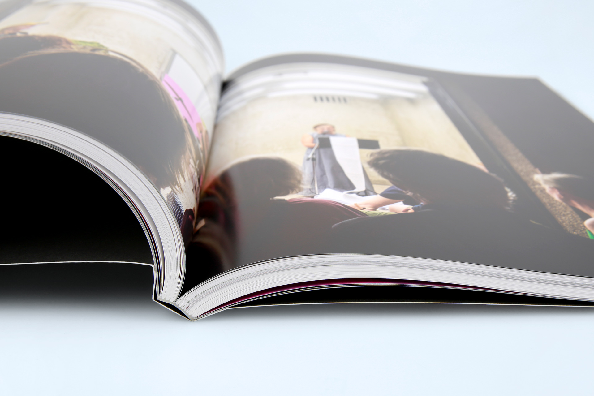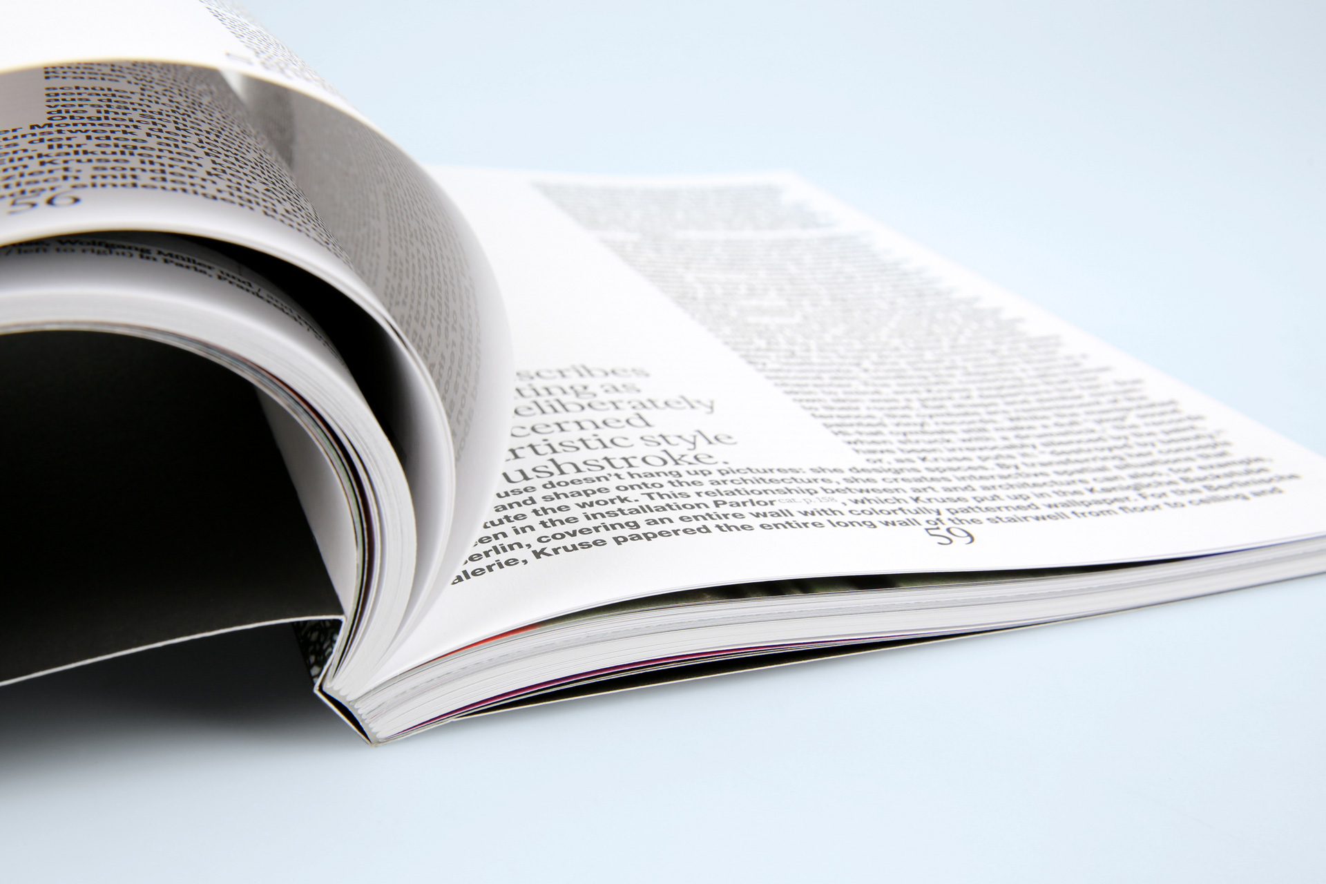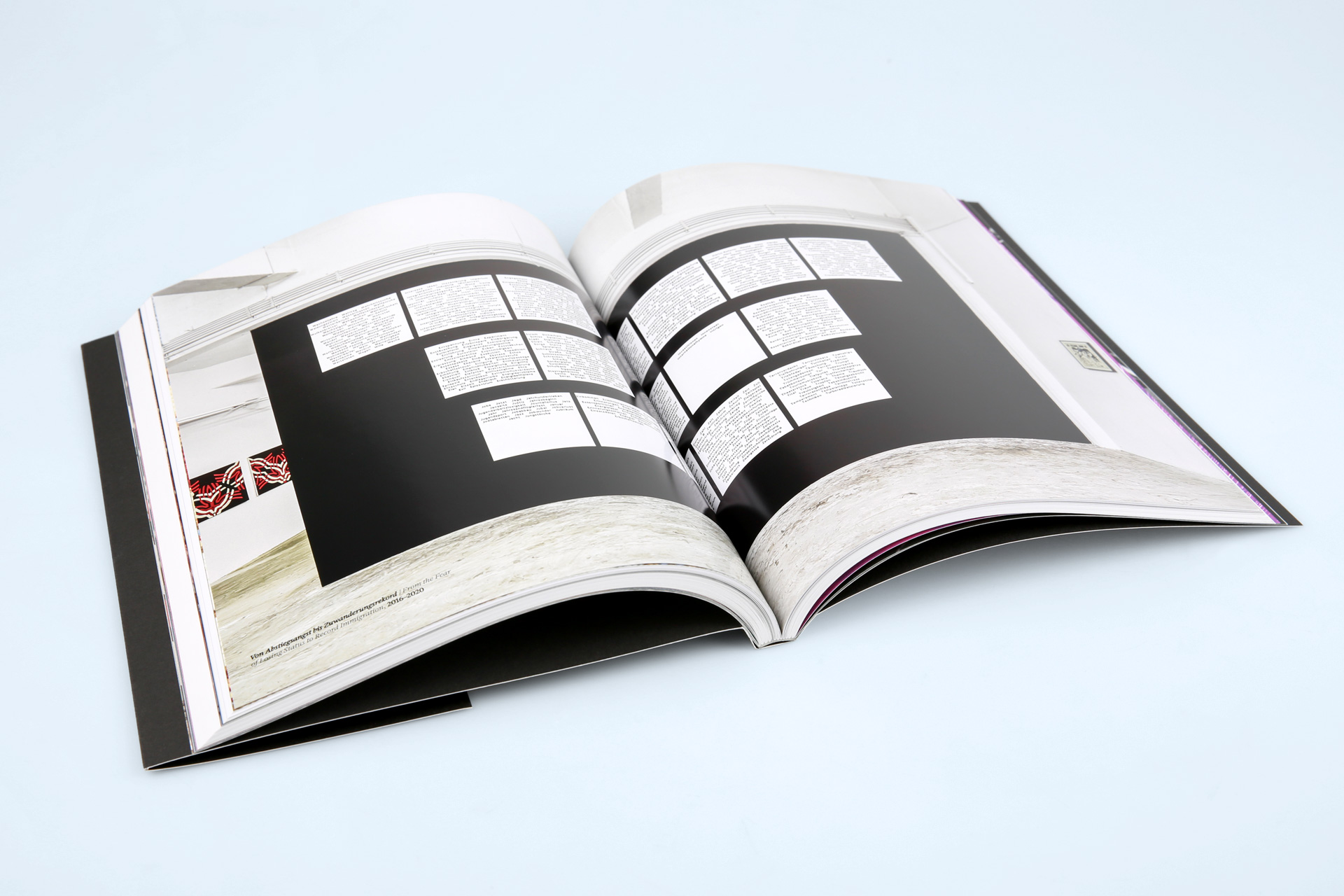 Dieses Konzept findet sich auch im Innenteil der Hohlrückenboschur wider: Hier wurden zwei verschiedene Papiere verwendet. Für die ersten und die abschließenden Seiten wurde das ungestrichene Papier des Umschlags in einer leichteren Grammatur gewählt. Der mittlere Teil der Broschur, der farbintensive Abbildungen bereithält, wurde auf gestrichenem Papier gedruckt.