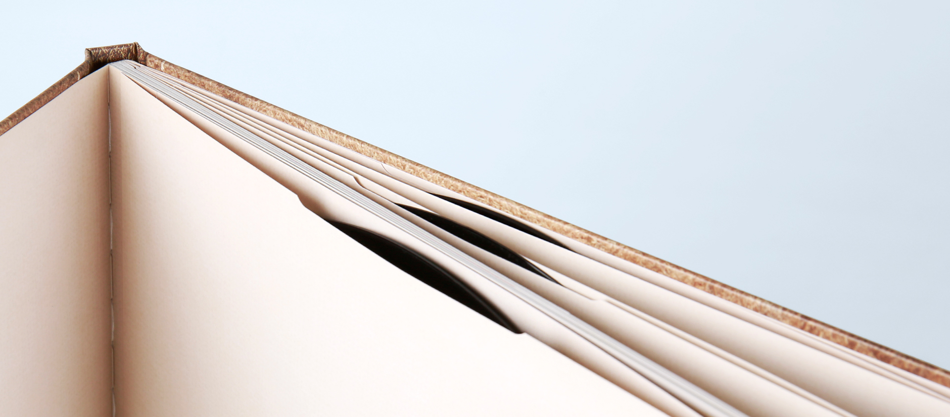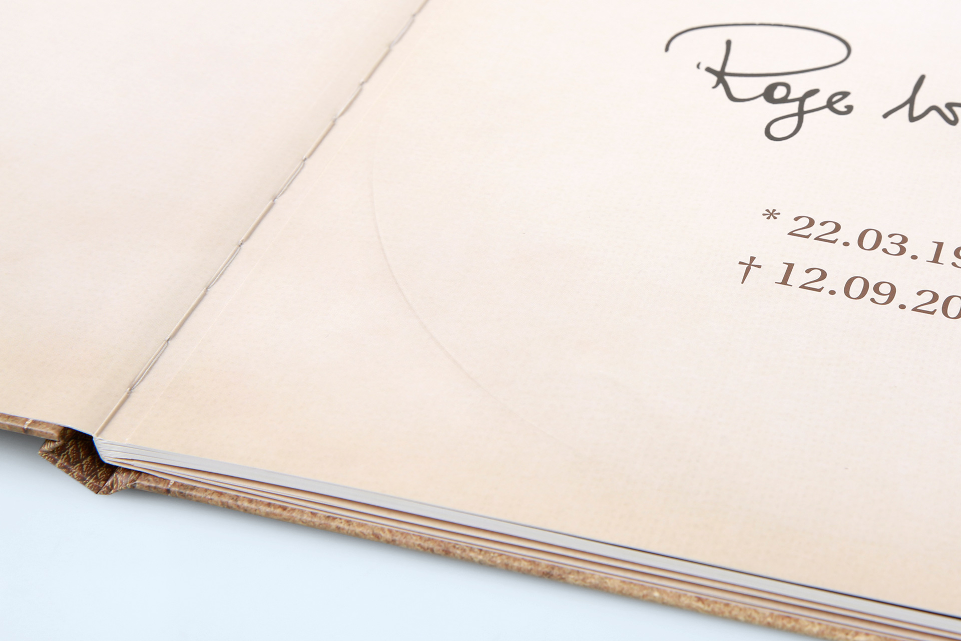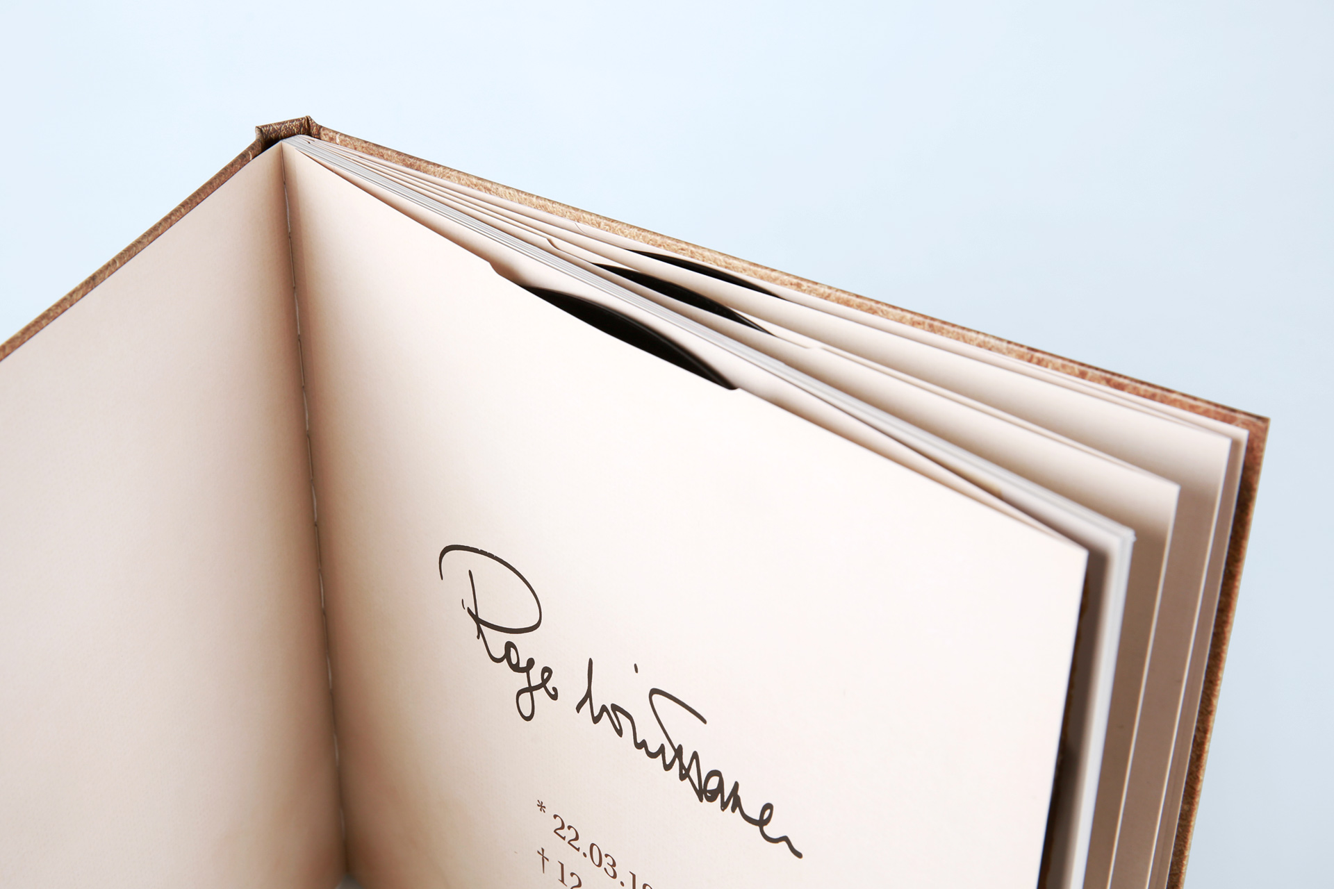 Das Hardcover im Schallplattenformat bietet ausreichend Platz für drei freischwingende Schallplattentaschen – eine vor den 40 Buchseiten und zwei dahinter, fest eingebunden im fadengehefteten Buchblock. Zur besseren Entnahme wurden die Taschen mit einem Griffloch an der oberen Seite gefertigt.